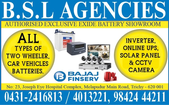 திருச்சி மேலப்புதூர் ஜோசப் கண் மருத்துவ மனை வளாகத்தில் அமைந்துள்ள இந்த நிறுவனத்தில் அனைத்து விதமான இருசக்கர வாகனங்கள் மற்றும் கார்களுக்கான பேட்டரிகள், இன்வெர்ட்டர் பேட்டரி, ஆன்லைன் யு .பி. எஸ், சோலார் பேனல்ஸ் மற்றும் சிசிடிவி கேமராக்கள் விற்பனை செய்யப்பட்டு வருகிறது.