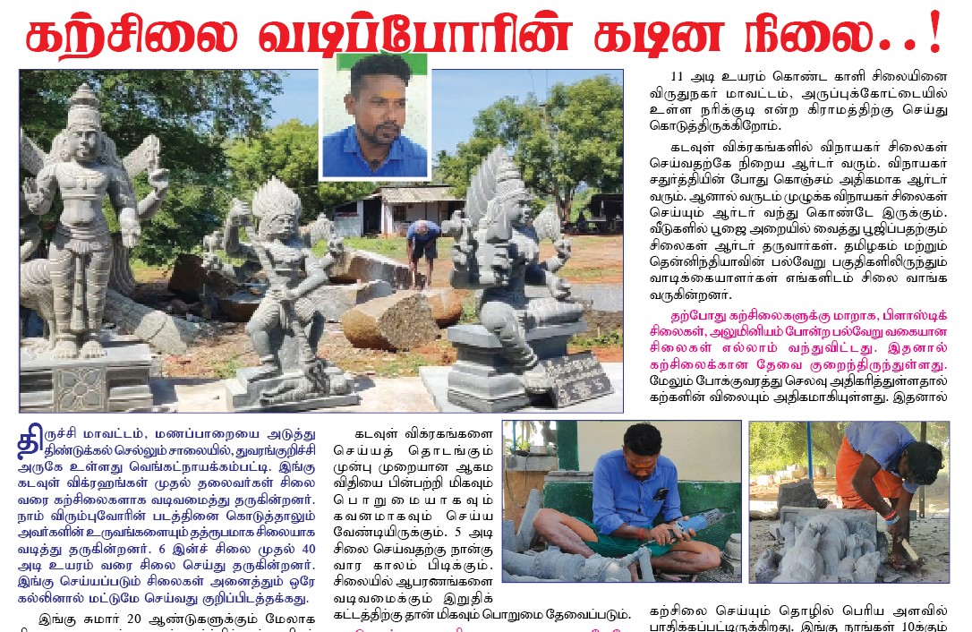 தற்போது கற்சிலைகளுக்கு மாறாக, பிளாஸ்டிக் சிலைகள், அலுமினியம் போன்ற பல்வேறு வகையான சிலைகள் எல்லாம் வந்துவிட்டது. இதனால் கற்சிலைக்கான தேவை குறைந்திருந்துள்ளது. மேலும் போக்குவரத்து செலவு அதிகரித்துள்ளதால் கற்களின் விலையும் அதிகமாகியுள்ளது. இதனால் கற்சிலை செய்யும் தொழில் பெரிய அளவில் பாதிக்கப்பட்டிருக்கிறது. இங்கு நாங்கள் 10க்கும் மேற்பட்டோர் குடும்பமாக இருந்து இந்த தொழிலை செய்து வருகிறோம். கொரோனா காலகட்டத்தில் சிலைகளின் தேவை குறைந்து போனதால் எங்கள் வாழ்வாதாரம் பெருமளவு பாதிக்கப்பட்டுள்ளது. தமிழக அரசு எங்களைப் போன்ற சிற்பக்கலைஞர்கள் வங்கிகளில் மானியத்துடன் கடன் உதவி வழங்கியும், நலவாரியம் அமைத்து உதவவும் தேவையான நடவடிக்கை எடுக்க வேண்டும் என்பதே எங்களது கோரிக்கையாக உள்ளது” என்றார்.