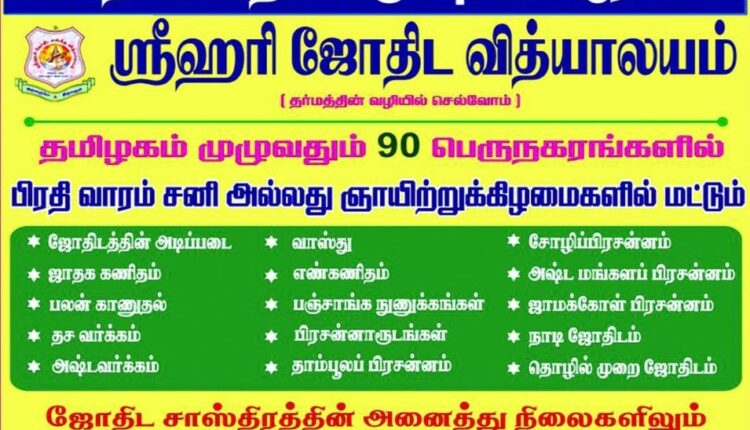 அனைத்து தரப்பு மக்களும் ஜோதிட ஞானம் பெற இறைவன் அனுக்ரஹிக்க வேண்டும் என்று இறைவனிடம் சங்கல்பம் செய்து கொண்டு, கடந்த 15 ஆண்டு காலமாக, பல்லாயிரக்கணக்கான ஜோதிட மாணவர்களை உருவாக்கிய தேனி மாவட்டத்தை தலைமையிடமாக கொண்ட ஸ்ரீஹரி ஜோதிட வித்யாலயம் தனது 33 – வது புதிய ஜோதிட பயிற்சி வகுப்புகளை தமிழகம் மற்றும் சிங்கப்பூர், மலேசியா உள்ளிட்ட பல்வேறு நாடுகளில் உள்ள 90 கிளைகளில் தற்போது துவங்கி உள்ளது. மேலும்,  இவ்வகுப்புகள் தொர்ந்து பிரதி வாரம் சனி அல்லது ஞாயிற்றுக்கிழமைகளில் நடைபெறுகிறது.
